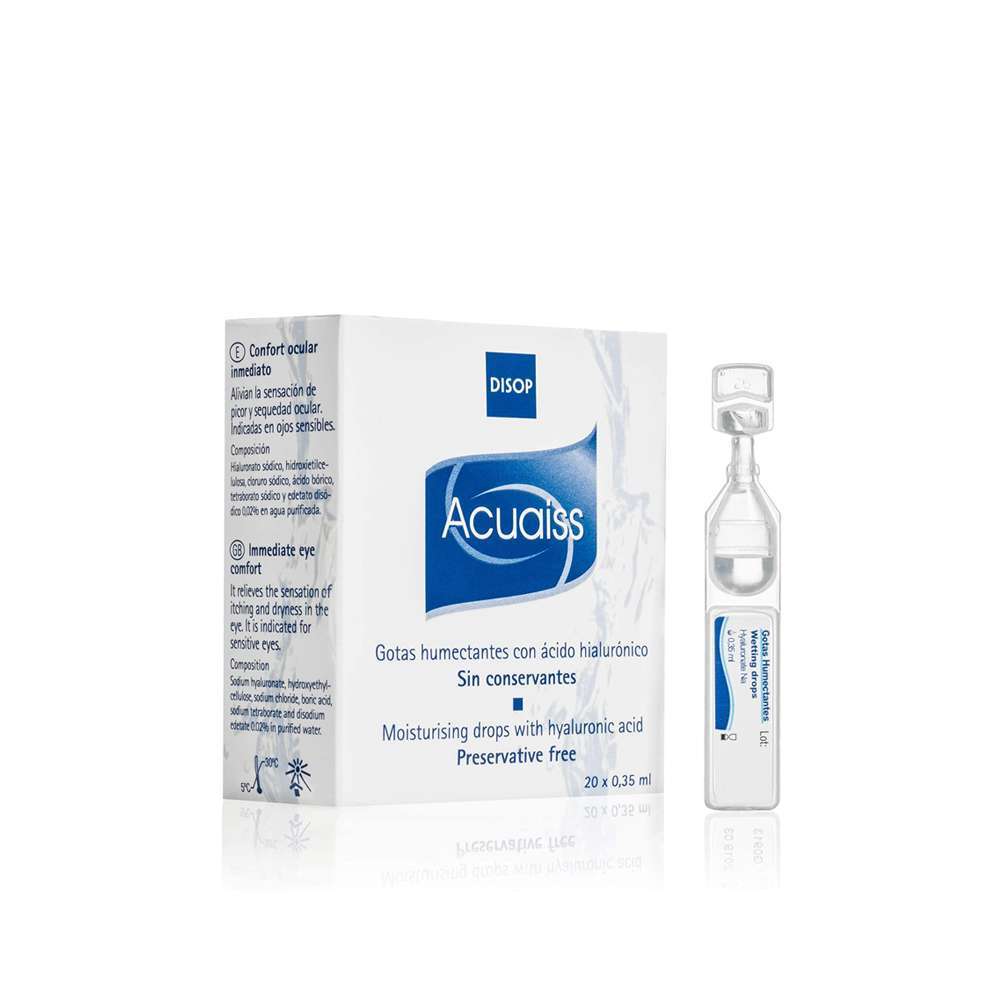 Com Acuaiss gotas hidratantes hidrata os seus olhos imediatamente aliviando a sensação de secura ocular. Tem como principal ingrediente ativo o ácido hialurônico, um componente da estrutura ocular que estabiliza o rasgo e o torna mais fluido.